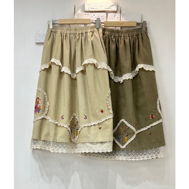 (現貨) #1693 日系登心絨料繡圖案拼通花有袋半截裙 (腰26-42吋 Hip58吋 長31吋)