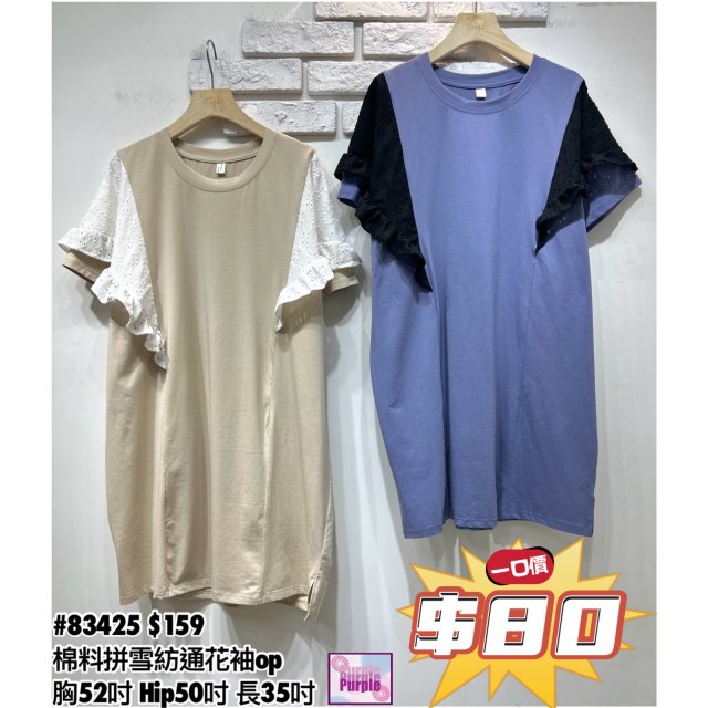 (現貨) #83425 棉料拼雪紡通花ruffle袖連身裙(胸52吋 Hip50吋 長35吋)