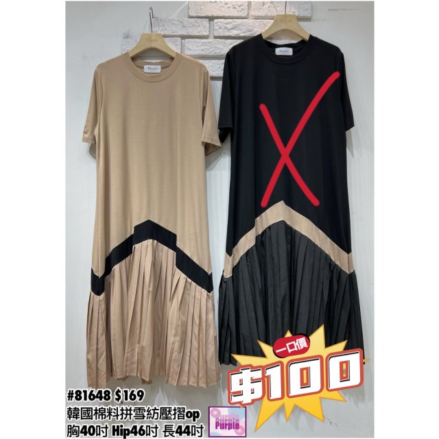 (現貨) #81648 韓國棉料拼雪紡壓摺連身裙 (胸40吋 Hip46吋 長44吋)