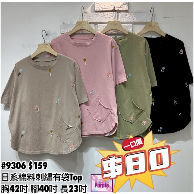 (現貨) #9306 日系棉料刺繡花有袋Top (胸42吋 腳40吋 長23吋)