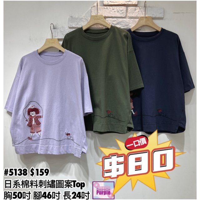 (現貨) #5138 日系棉料刺繡圖案Top (胸50吋 腳46吋 長24吋)