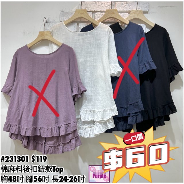 (現貨) #231301 棉麻料拼ruffle邊後扣鈕款Top (胸48吋 腳56吋 長24-26吋)