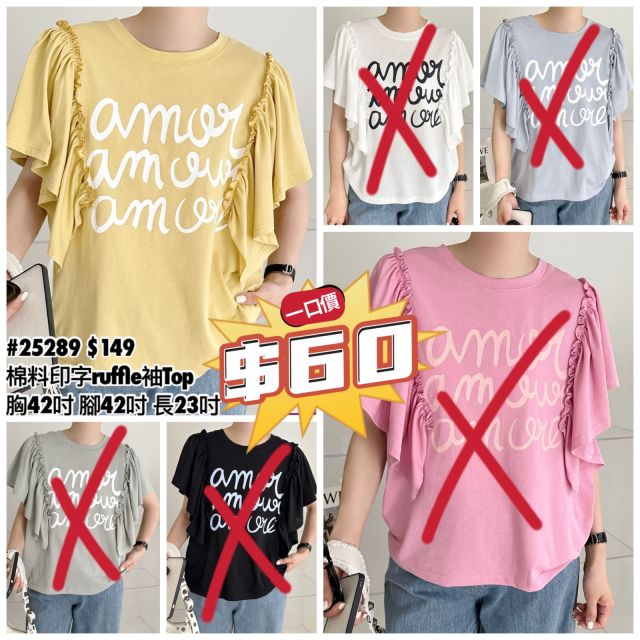 (現貨) #25289 BONNIE棉料印字ruffle袖Top (胸42吋 腳42吋 長23吋)