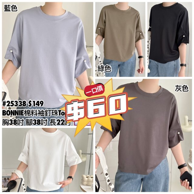 (現貨) #25338 BONNIE棉料袖釘珠Top (胸38吋 腳38吋 長22吋)