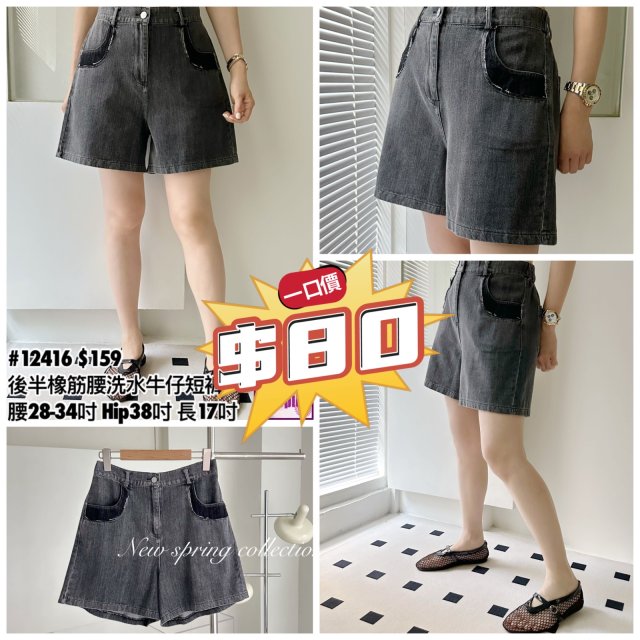 (現貨) #12416 BONNIE後半橡筋腰洗水牛仔短褲 (腰28-34吋 Hip38吋 長17吋)