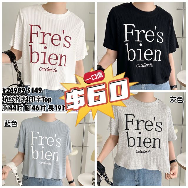 (現貨) #24989 BONNIE坑紋棉料印字Top (胸44吋 腳46吋 長19吋)