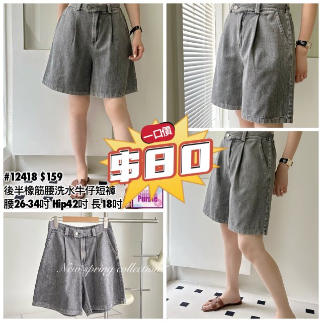 (現貨) #12418 BONNIE後半橡筋腰洗水牛仔短褲 (腰26-34吋 Hip42吋 長18吋)