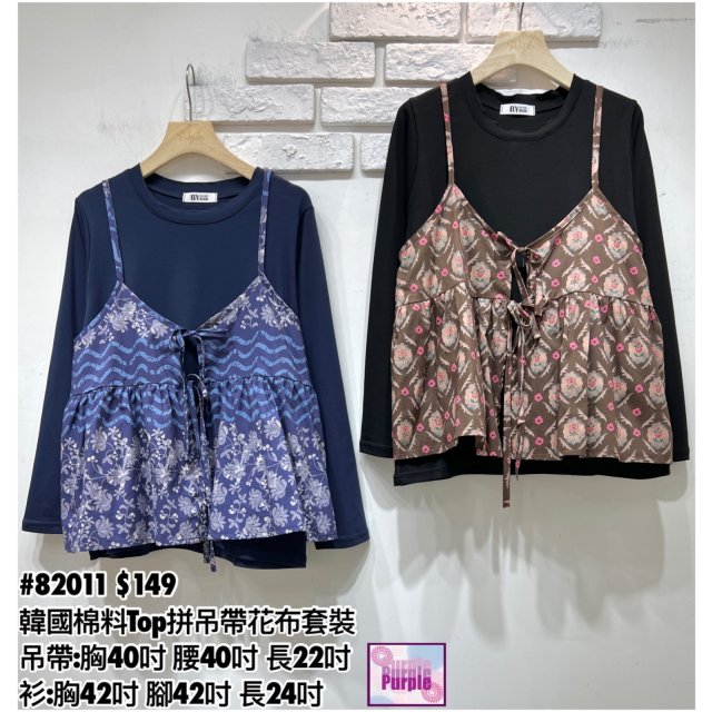 (現貨) #82011 韓國棉料Top拼吊帶花布背心套裝 (吊帶:胸40吋 腰40吋 長22吋/衫:胸42吋 腳42吋 長24吋)