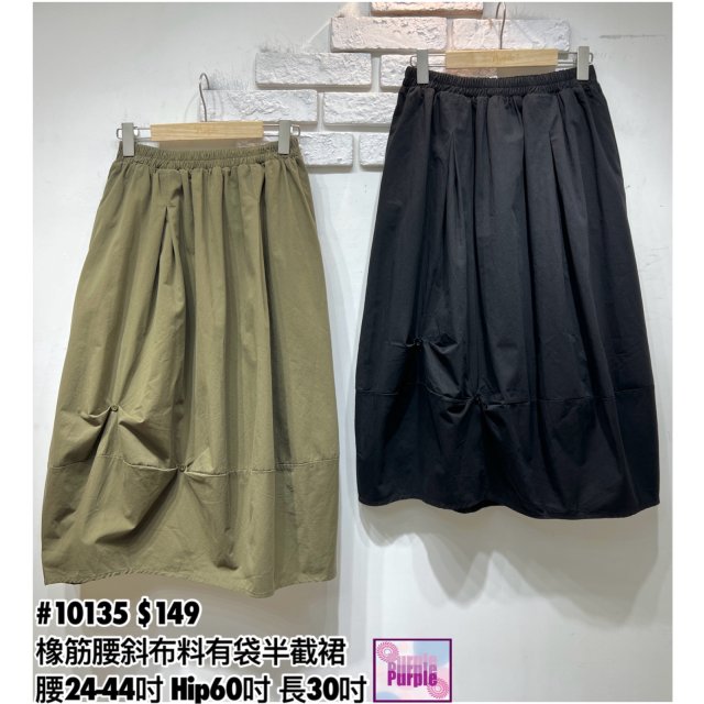(現貨) #10135 橡筋腰斜布料有袋半截裙 (腰24-44吋 Hip60吋 長30吋)