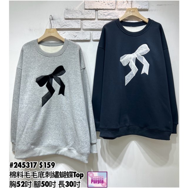 (訂貨大約20天) #245317 棉料毛毛底刺繡蝴蝶Top (胸52吋 腳50吋 長30吋)