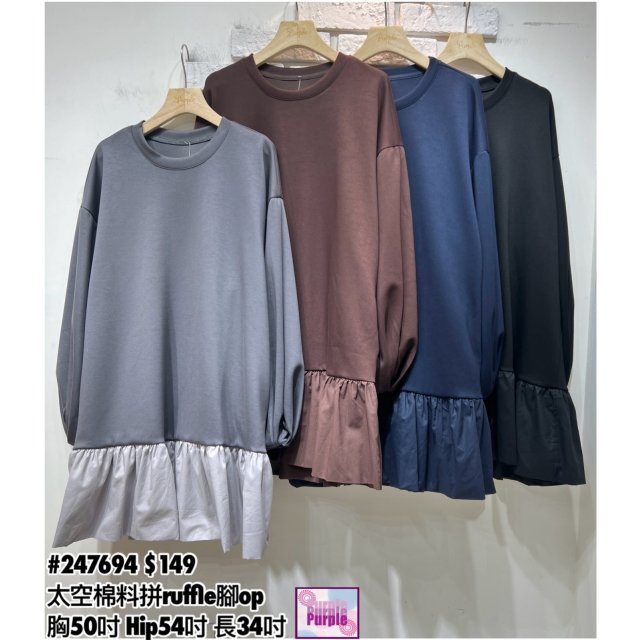 (現貨) #247694 太空棉料拼ruffle腳有袋連身裙 (胸50吋 Hip54吋 長34吋)