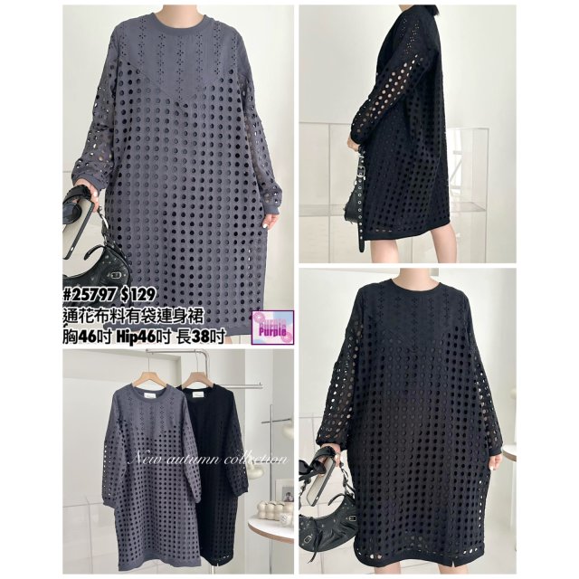 (現貨) #25797 BONNIE通花布料有袋連身裙 (胸46吋 Hip46吋 長38吋)