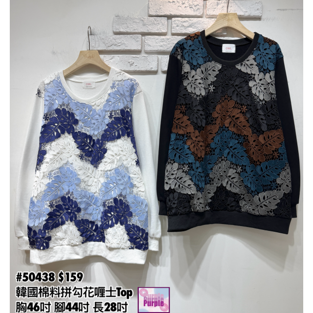 (訂貨大約20天) #50438 韓國珠地棉料拼勾花喱士Top (胸46吋 腳44吋 長28吋)
