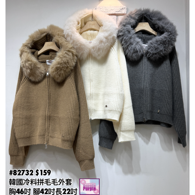 (訂貨大約20天) #82732 韓國針織坑紋料拼毛毛有帽雙拉錬外套 (胸46吋 腳42吋長22吋)