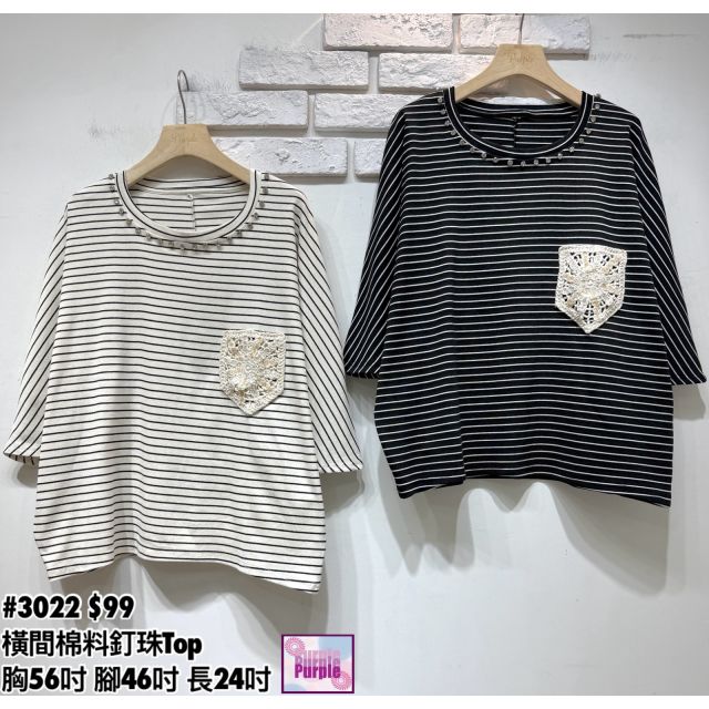 (訂貨約20天) #3022 橫間棉料釘珠Top (胸56吋 腳46吋 長24吋)