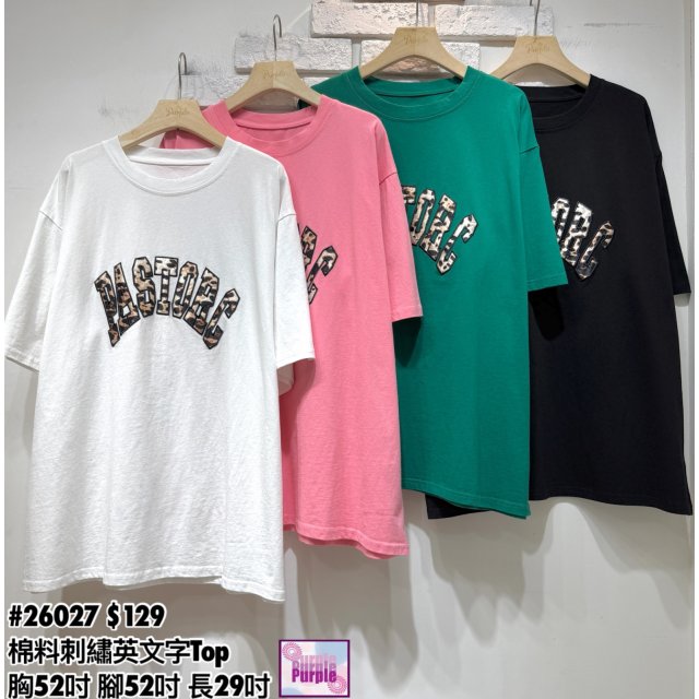 (訂貨約20天) #26027 棉料刺繡英文字Top (胸52吋 腳52吋 長29吋)
