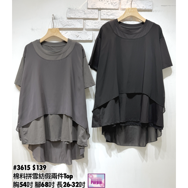(訂貨約20天) #3615 棉料拼雪紡假兩件Top (胸54吋 腳68吋 長26-32吋)