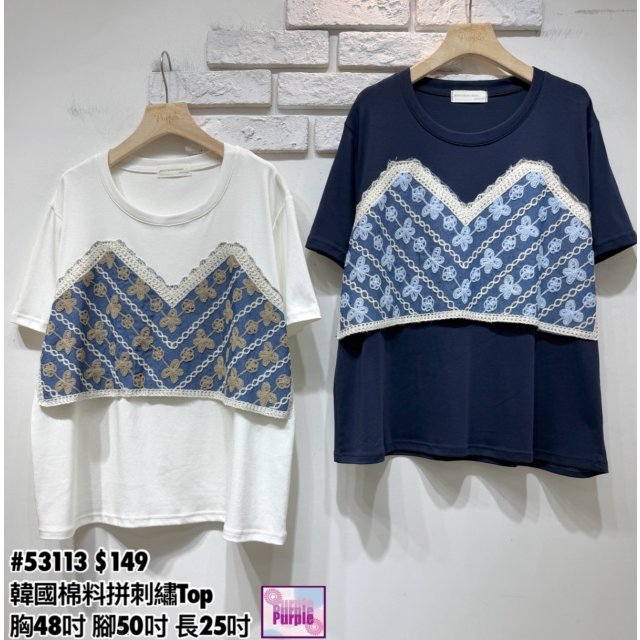 (訂貨約20天) #53113 韓國棉料拼刺繡Top (胸48吋 腳50吋 長25吋)
