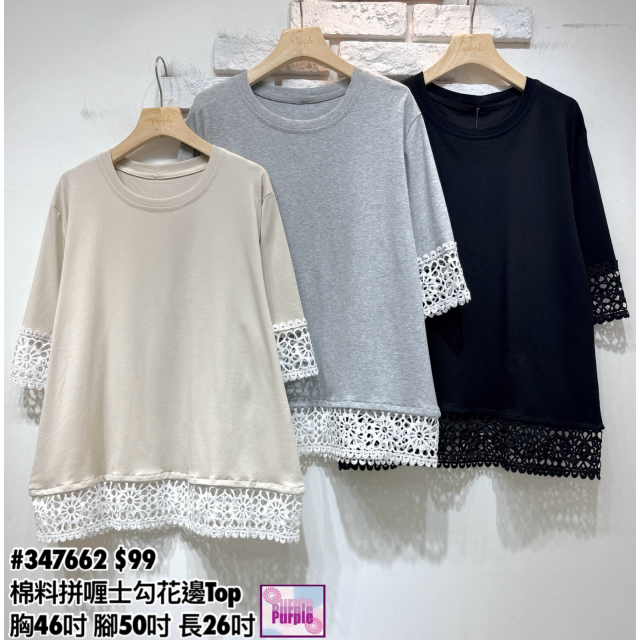 (訂貨約20天) #347662 棉料拼喱士勾花邊Top (胸46吋 腳50吋 長26吋)
