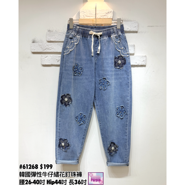 (訂貨約20天) #61268 韓國橡筋腰彈性牛仔繡花釘珠褲 (腰26-40吋 Hip44吋 長36吋)