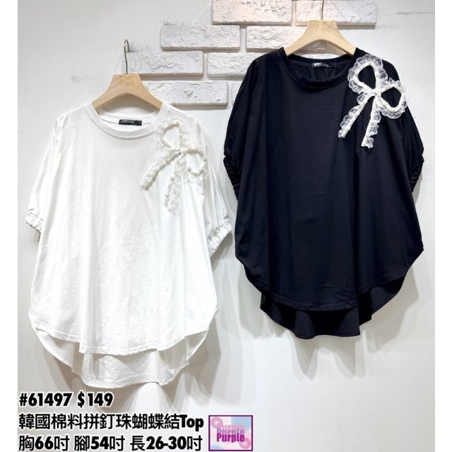 (訂貨約20天) #61497 韓國棉料後拼快乾料釘珠蝴蝶結Top (胸66吋 腳54吋 長26-30吋)