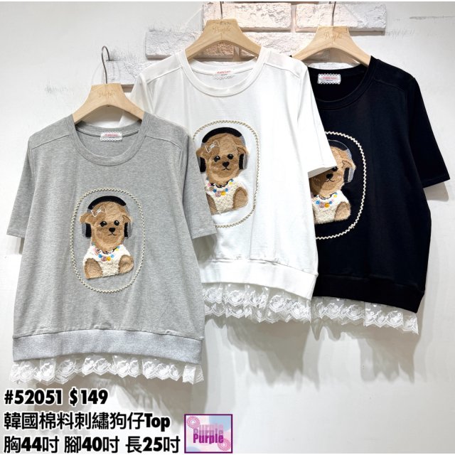 (訂貨大約20天) #52051 韓國棉料刺繡狗仔喱士腳Top (胸44吋 腳40吋 長25吋)