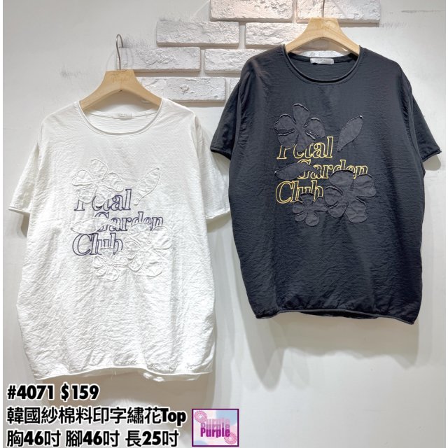 (訂貨大約20天) #54071 韓國紗棉料印字繡花Top (胸46吋 腳46吋 長25吋)
