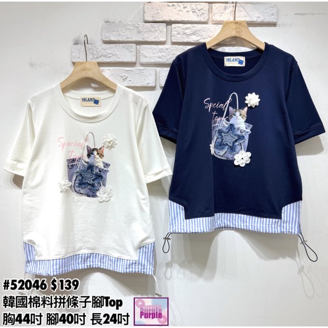 (訂貨約20天) #52046 韓國棉料印貓貓圖案條子腳Top (胸44吋 腳40吋 長24吋)