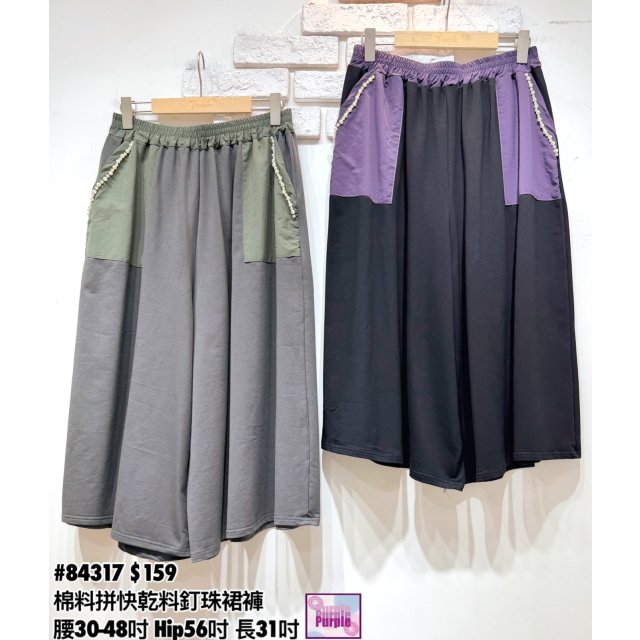 (訂貨約20天) #84317 橡筋腰棉料拼快乾料釘珠裙褲 (腰30-48吋 Hip56吋 長31吋)