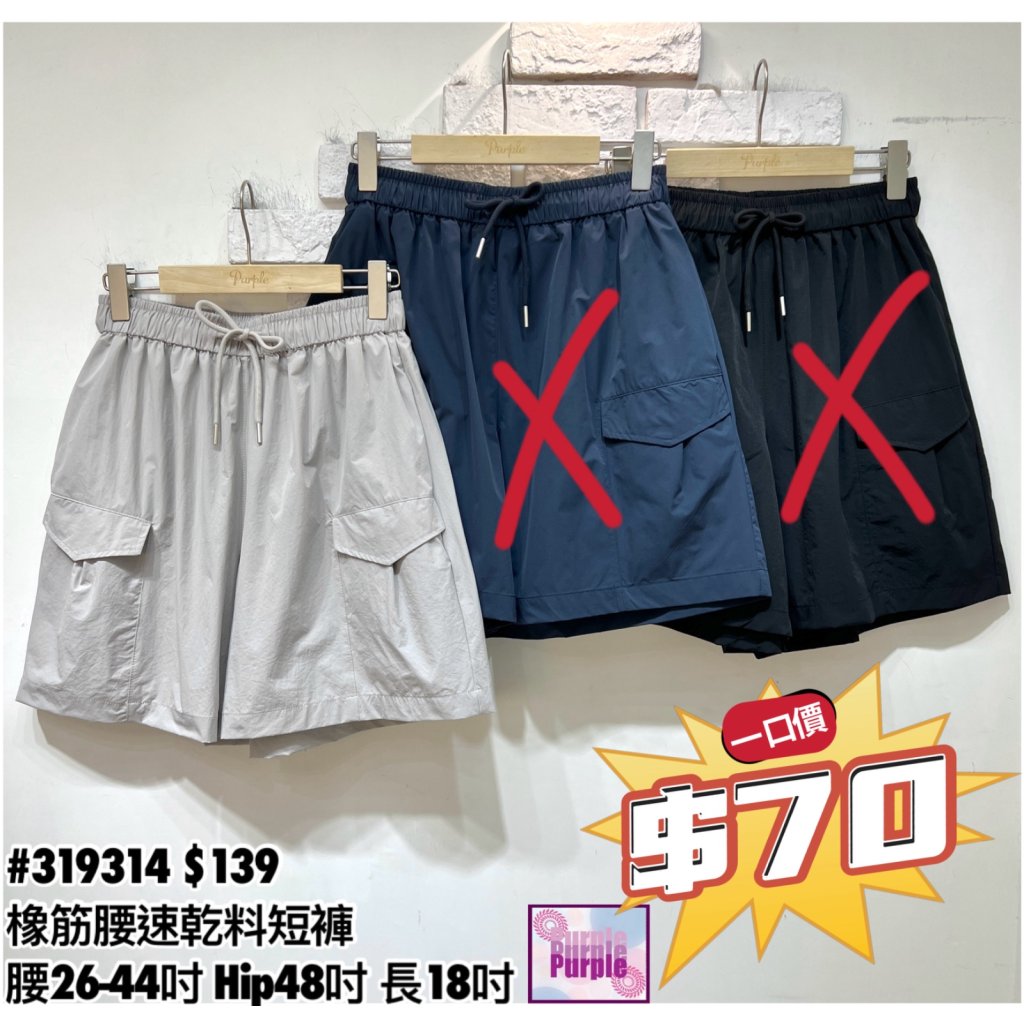 (現貨) #319314 橡筋腰速乾料短褲 (腰26-44吋 Hip48吋 長18吋)