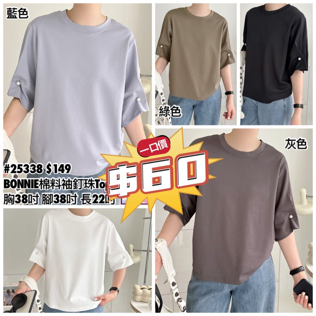 (現貨) #25338 BONNIE棉料袖釘珠Top (胸38吋 腳38吋 長22吋)