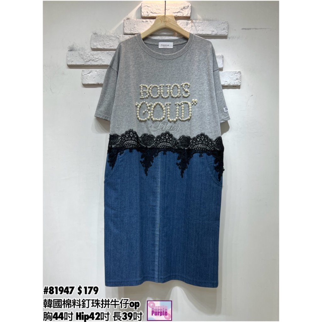 (現貨) #81947 韓國棉料釘珠拼牛仔有袋連身裙 (胸44吋 Hip42吋 長39吋)