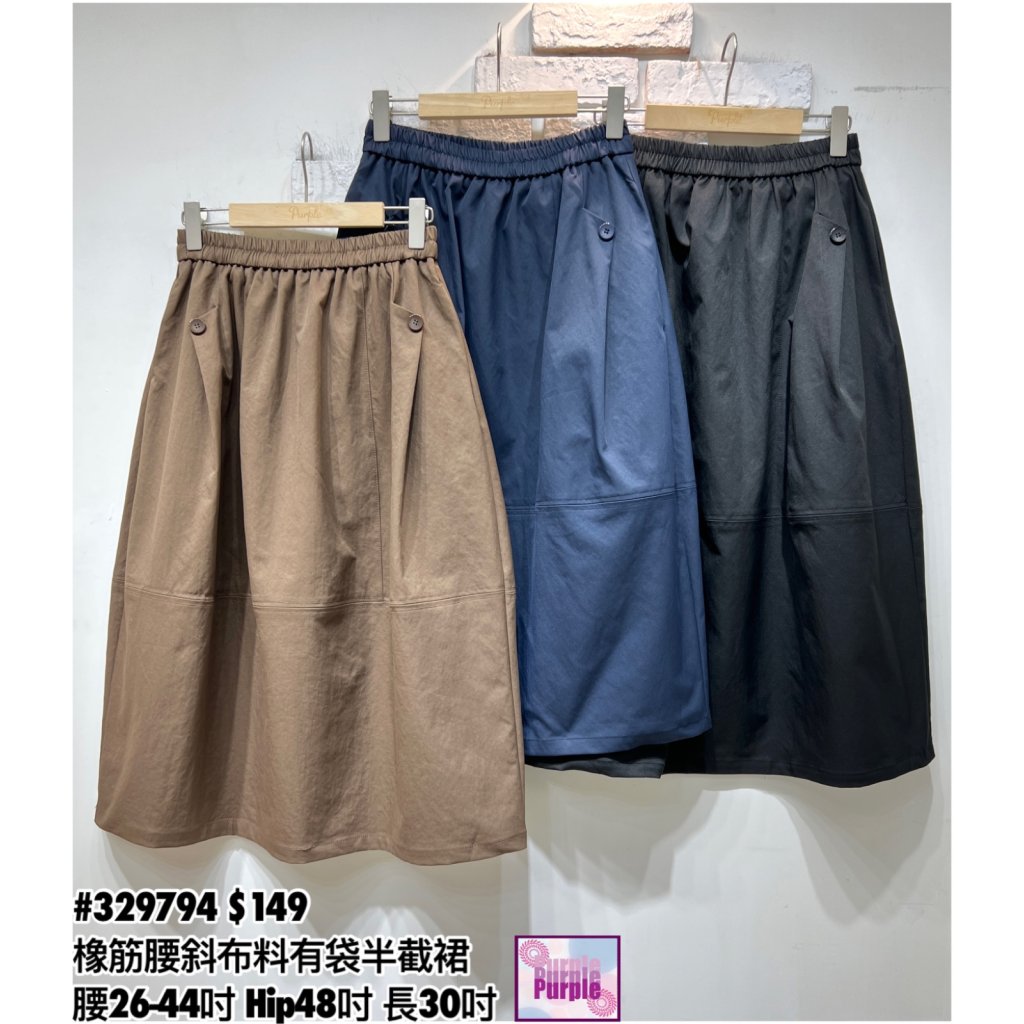 (現貨) #329794 橡筋腰斜布料有袋半截裙 (腰26-44吋 Hip48吋 長30吋)