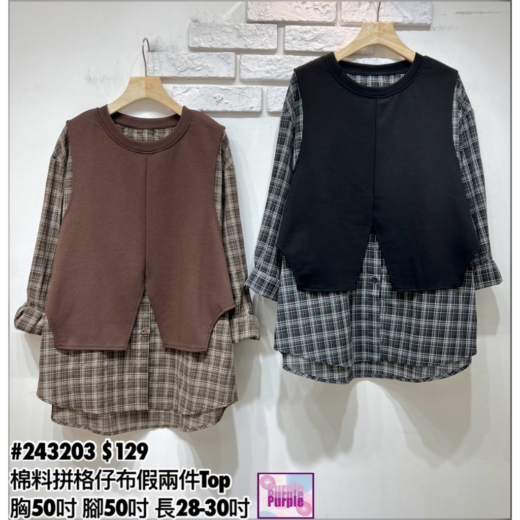 (訂貨大約20天) #243203 棉料拼格仔布假兩件Top (胸50吋 腳50吋 長28-30吋)