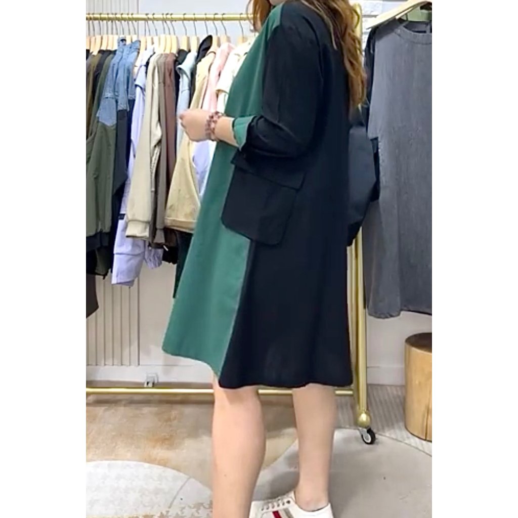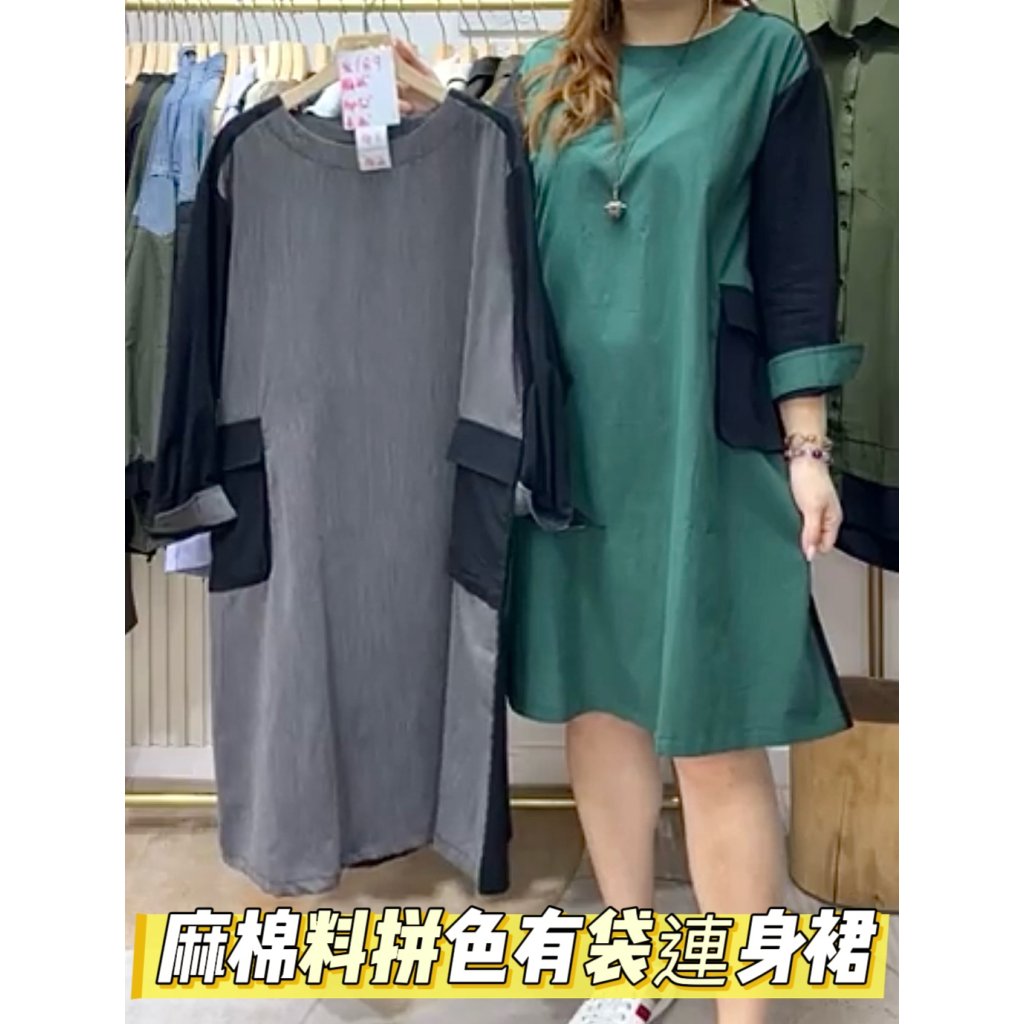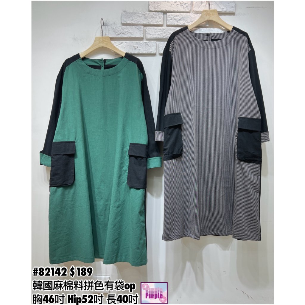 (現貨) #82142 韓國麻棉料拼色有袋連身裙 (胸46吋 Hip52吋 長40吋)
