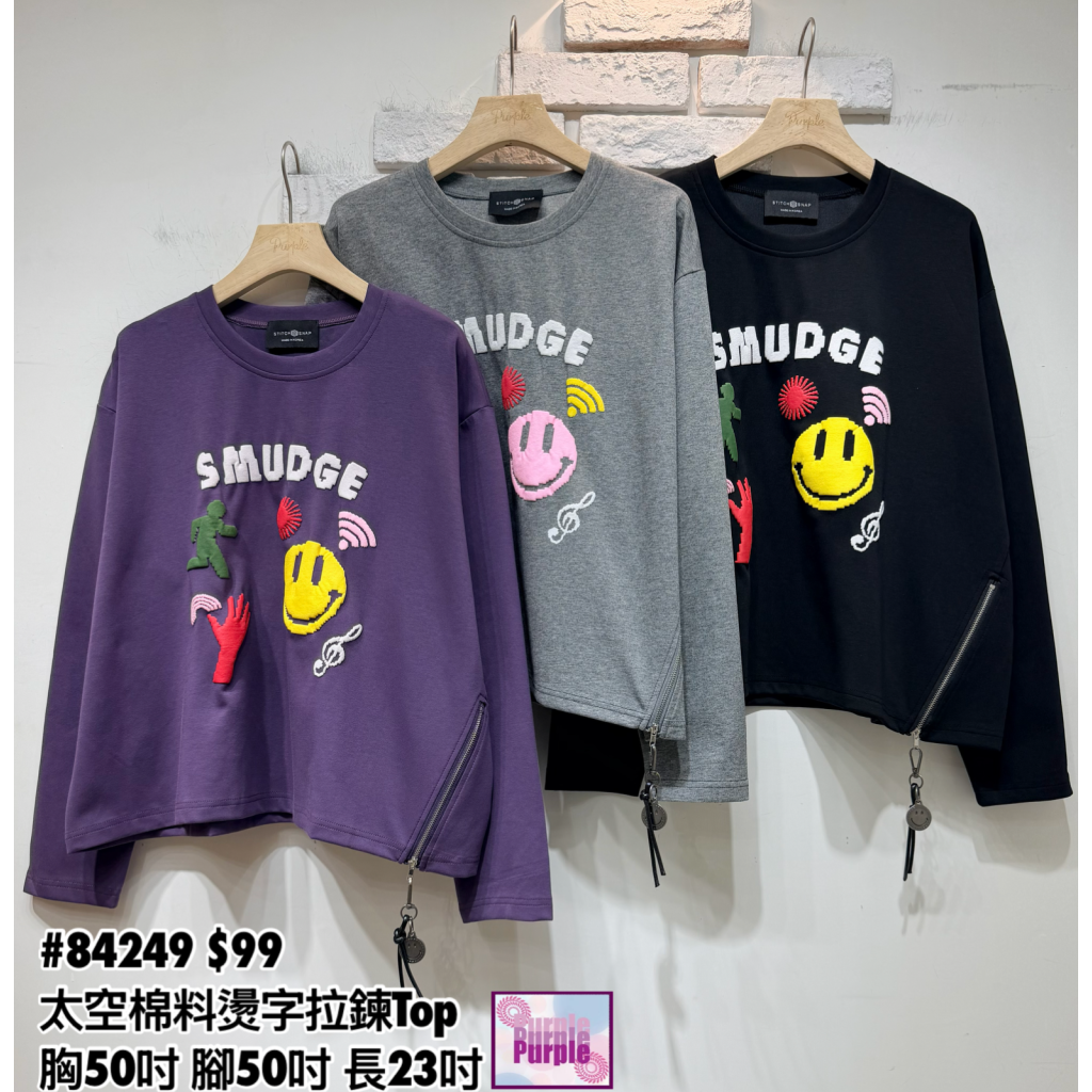 主頁 (現貨) #84249 太空棉料燙字拼拉鍊Top (胸50吋 腳50吋 長23吋)