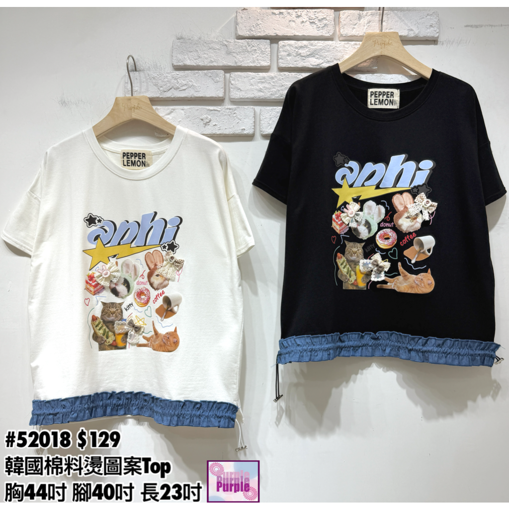 (訂貨約20天) #52018 韓國棉料燙圖案Top (胸44吋 腳40吋 長23吋)