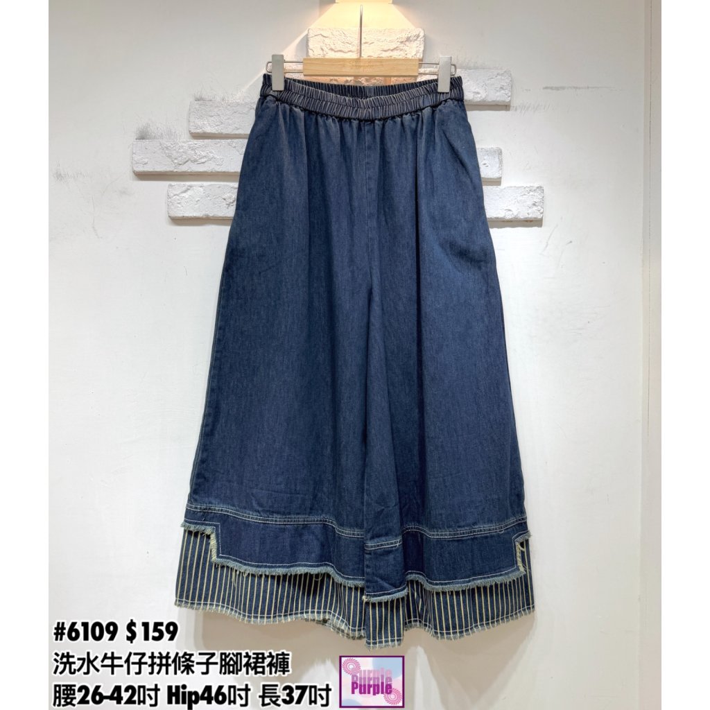 (訂貨約20天) #6109 橡筋腰洗水牛仔拼條子腳裙褲 (腰26-42吋 Hip46吋 長37吋)
