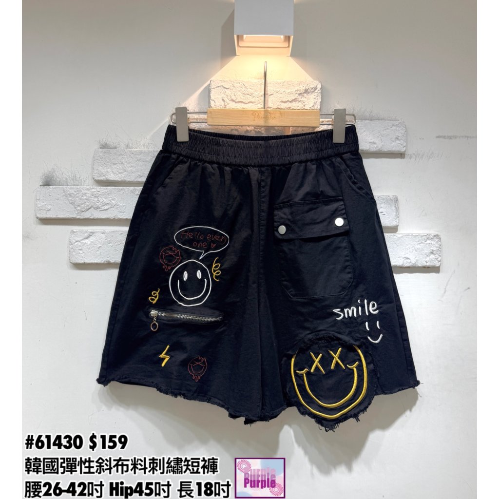 (訂貨大約20天) #61430 韓國彈性斜布料繡哈哈笑短褲 (腰26-42吋 Hip45吋 長18吋)