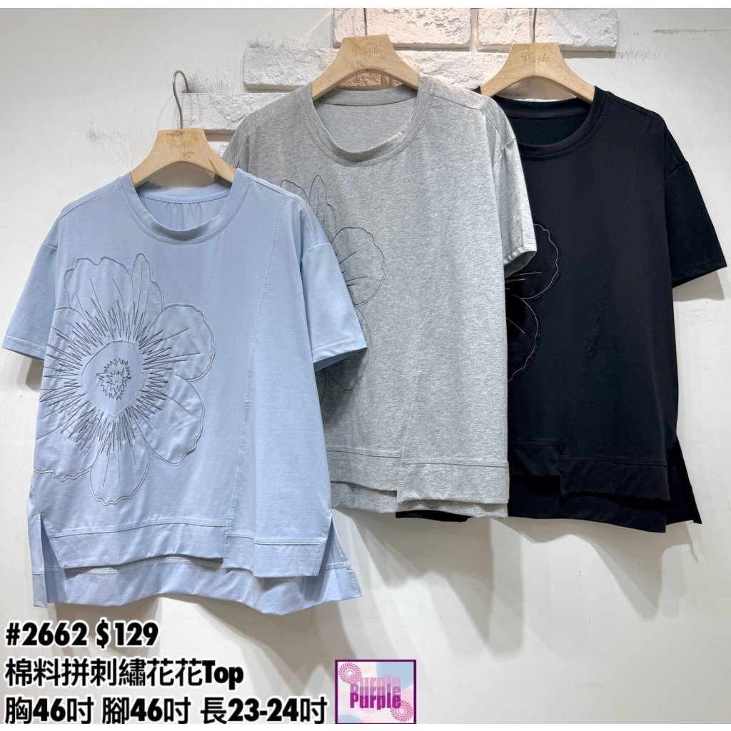 (訂貨大約20天) #2662 棉料拼刺繡花花Top (胸46吋 腳46吋 長23-24吋)